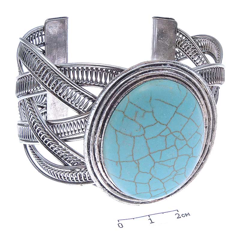 Браслет голубой с гальваническим покрытием под серебро с прессованной бирюзой, ширина 7см., высота 4см., украшение 4*5см, Арт. RA059-BRS, категория "Альфа".