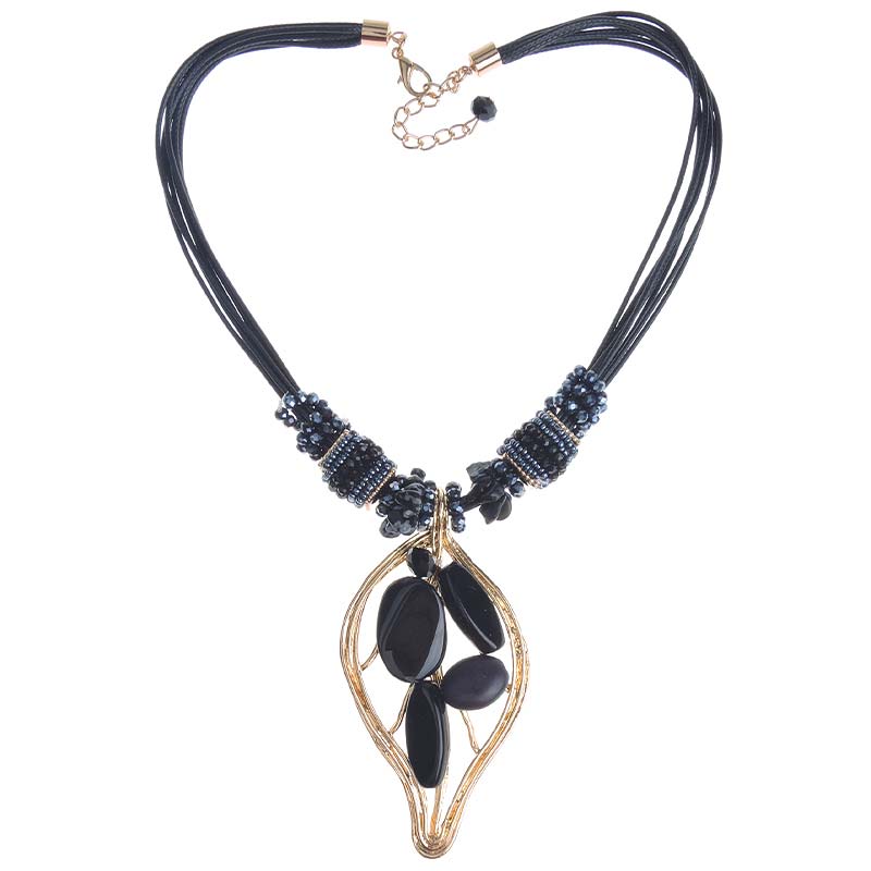 Подвеска чёрная с гальваническим покрытием под золото с бисером и камнями, длина 40+10см., украшение 5*10см, Арт. RA064-KO, Категория "Альфа".